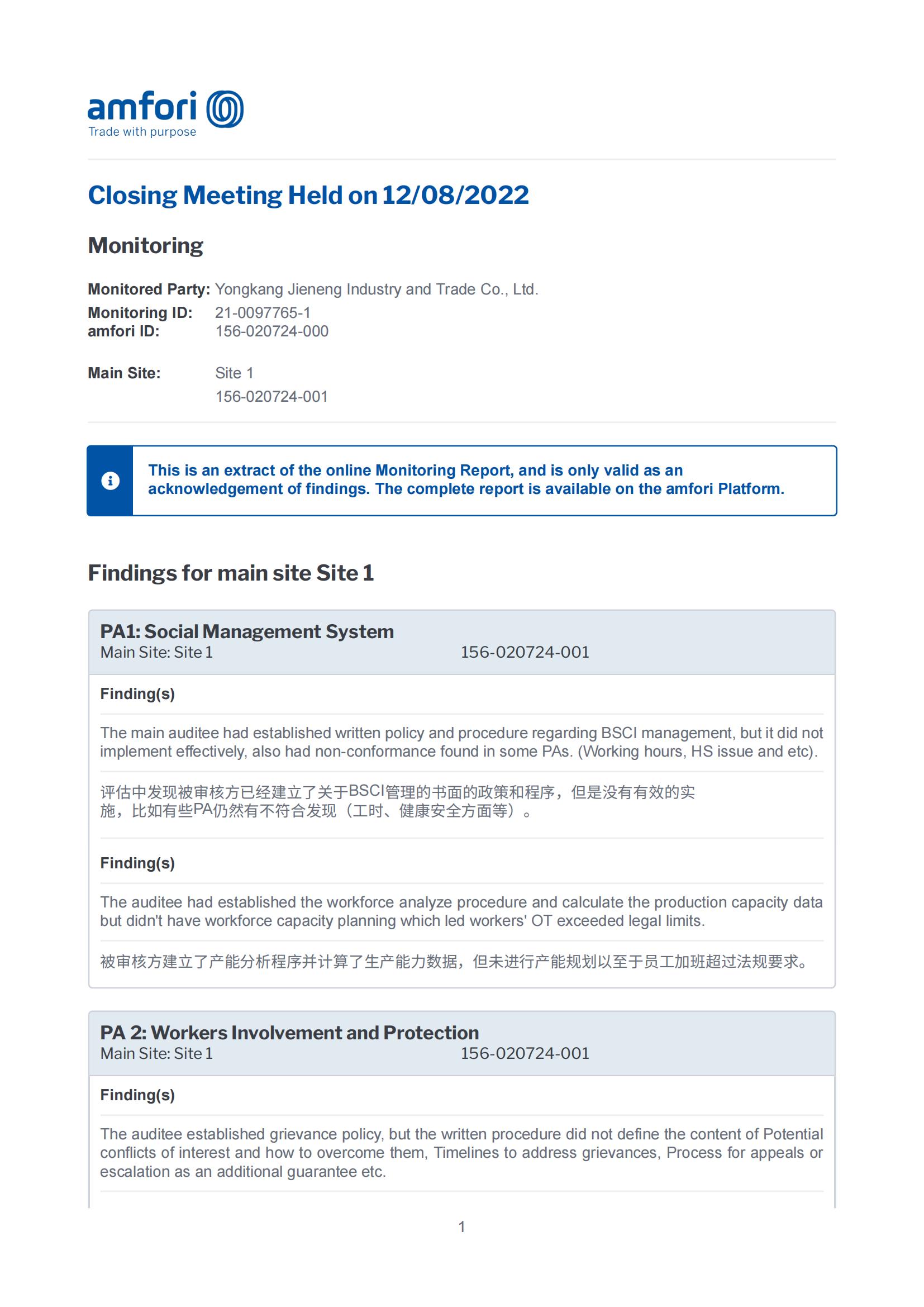 Yongkang Jieneng Industry and Trade BSCI Official Report